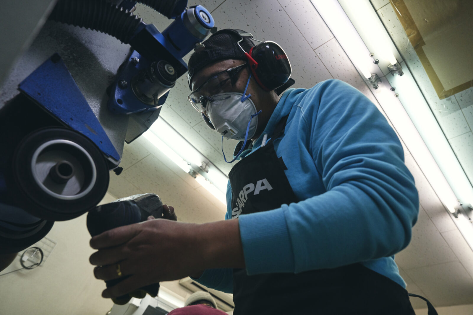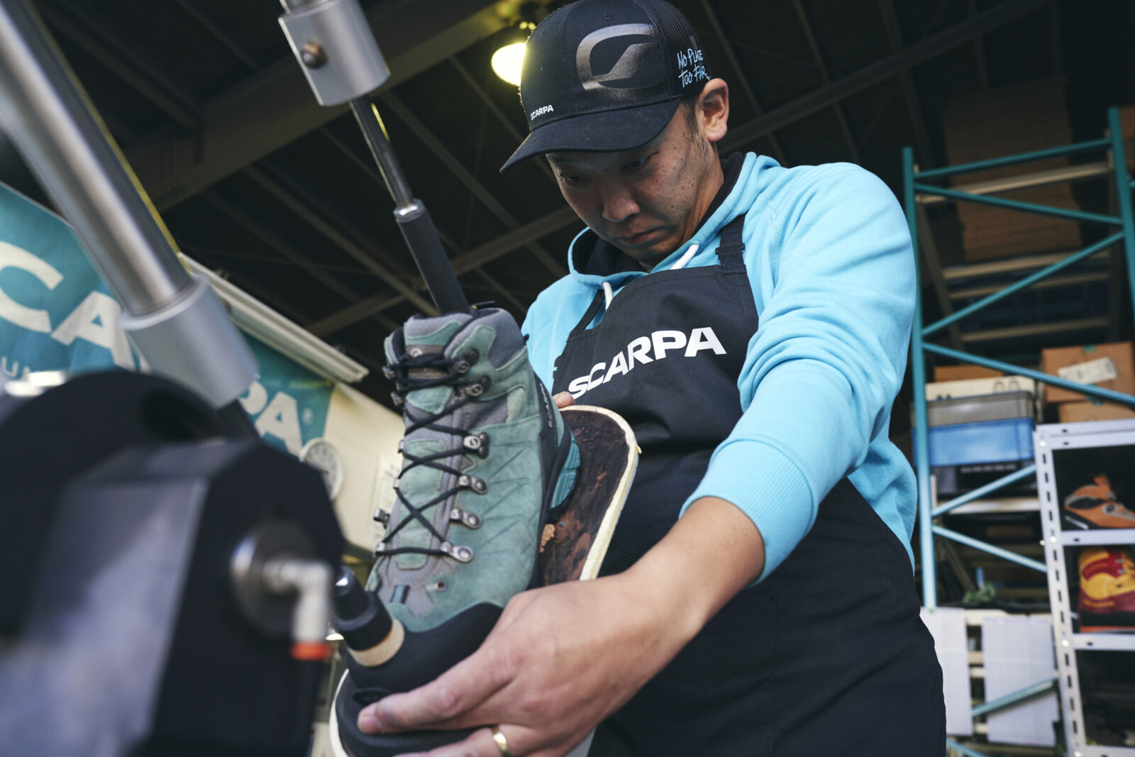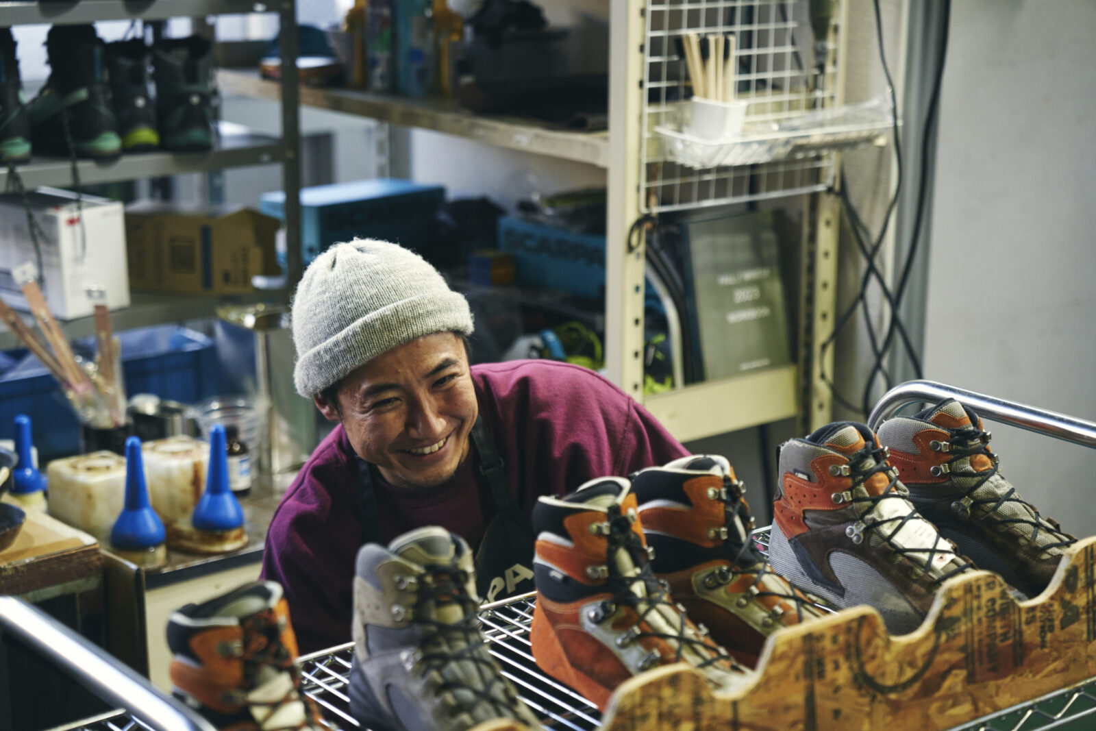 許山のユニークなところは、登山靴修理自体、見たことがなかったにも関わらず、入社面接直後の社内ツアーでスカルパ修理工房を目にし、ほとんど一目惚れしてしまったことだ。