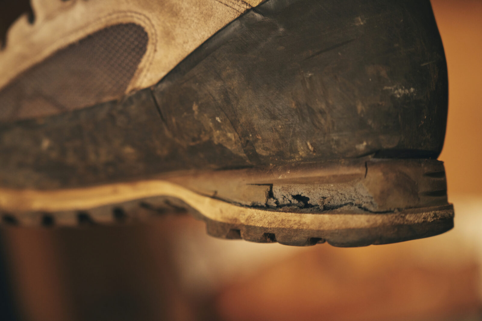 歩行によってすり減るのはアウトソールだが、着地のショックを和らげるミッドソールはポリウレタンやEVAという樹脂製のため、使用頻度が少なくても、製造から年数が経つと劣化する。アッパーとソールユニットの接着面も同様だ。