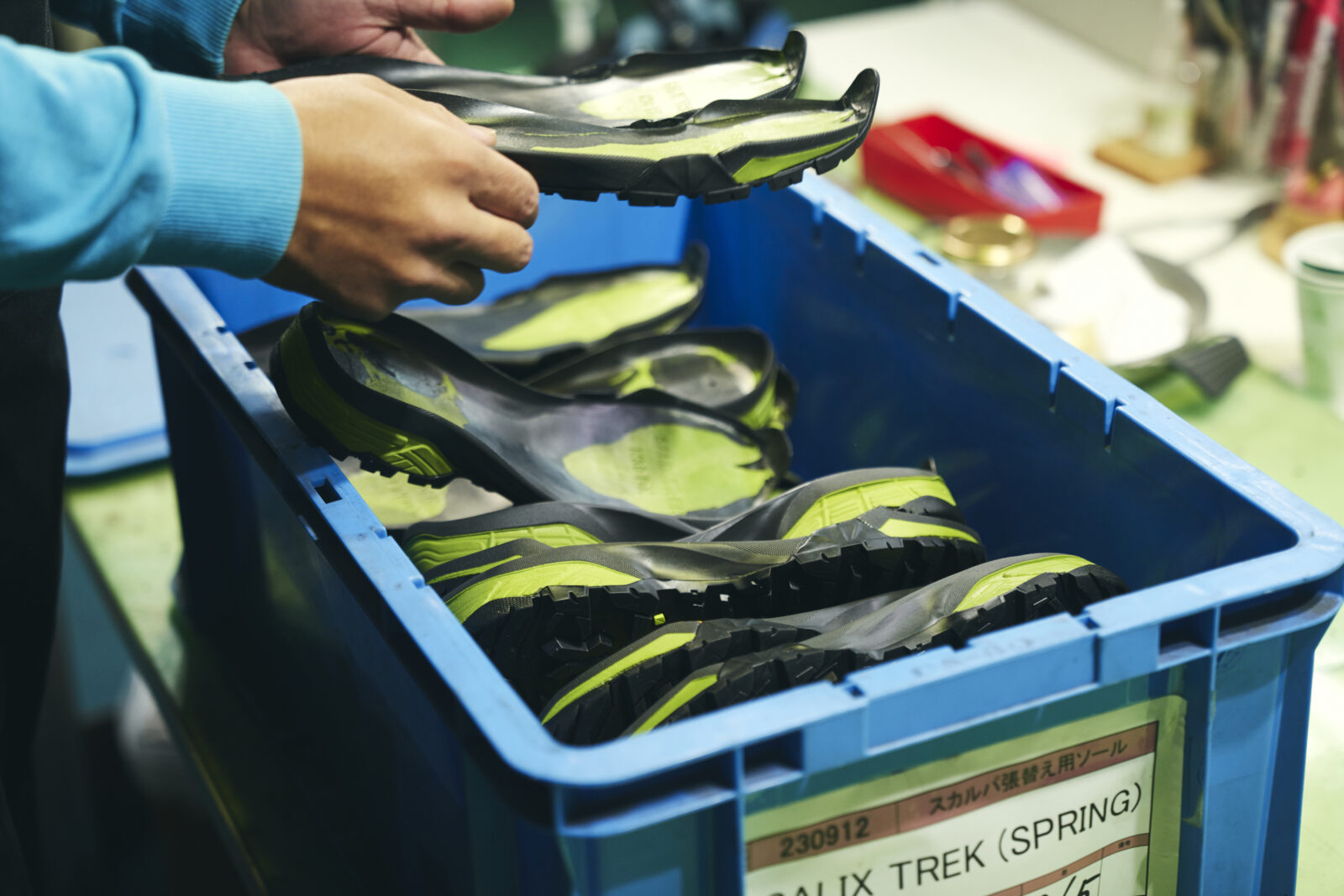 スカルパに限らず、ソール交換のニーズは年々高まっているようで、ロストアローでは2023年度に対応した登山靴は1,800足を超えた。その前年と比べて4、500足の増加となっている。それに対して修理チームは4人。受付のフロント専任が一人、修理人は砂田ともう2名で担当している。