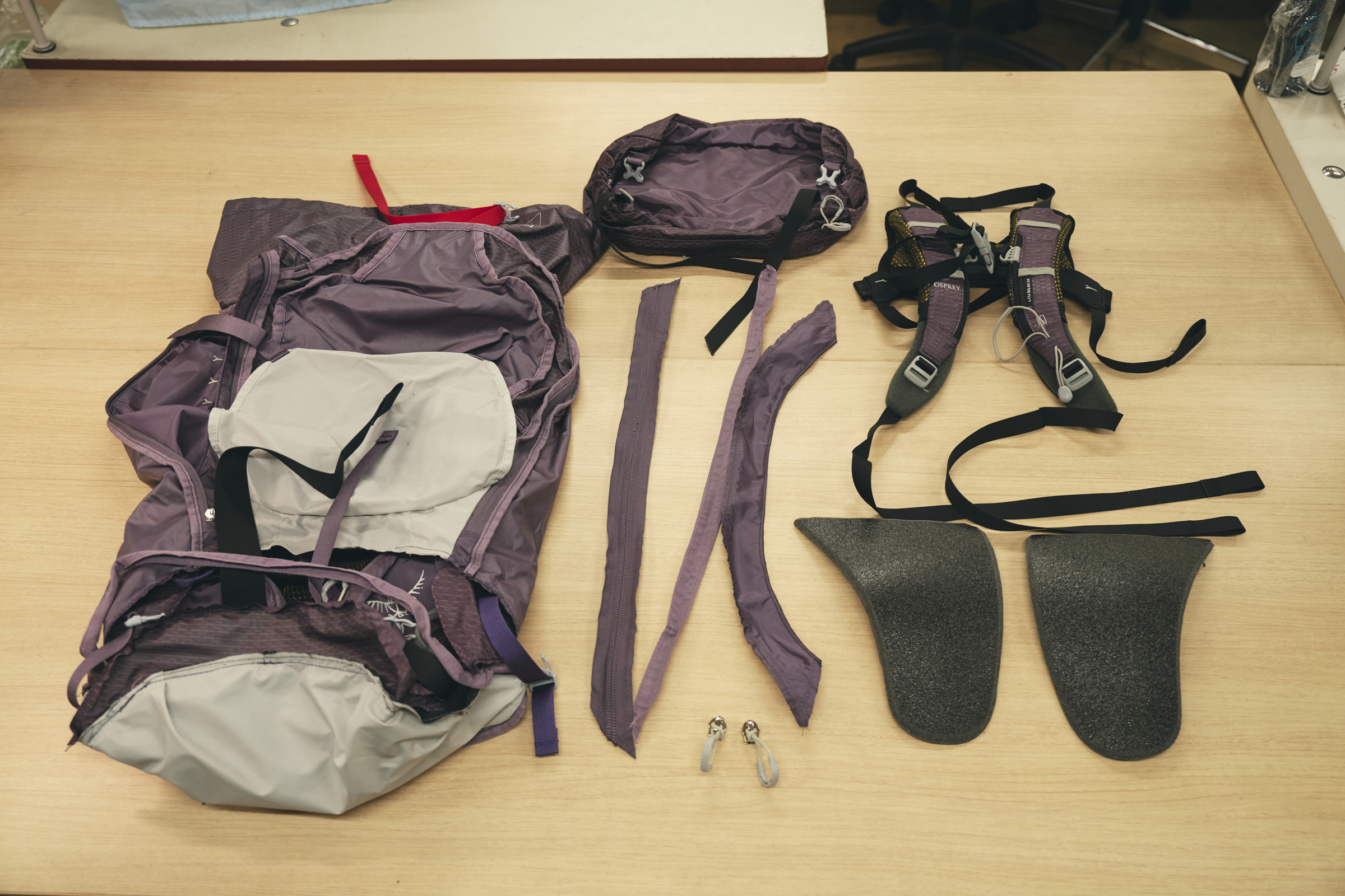 持ち込まれる製品は多岐にわたる。多数を占めるのはオスプレーやブラックダイヤモンドのバックパックだが、ほかにもアパレル、テント、シュラフ、クラッシュパッドなど、ロストアローが扱う11ブランドのなかで、布地パーツのある製品すべてが対象になる。